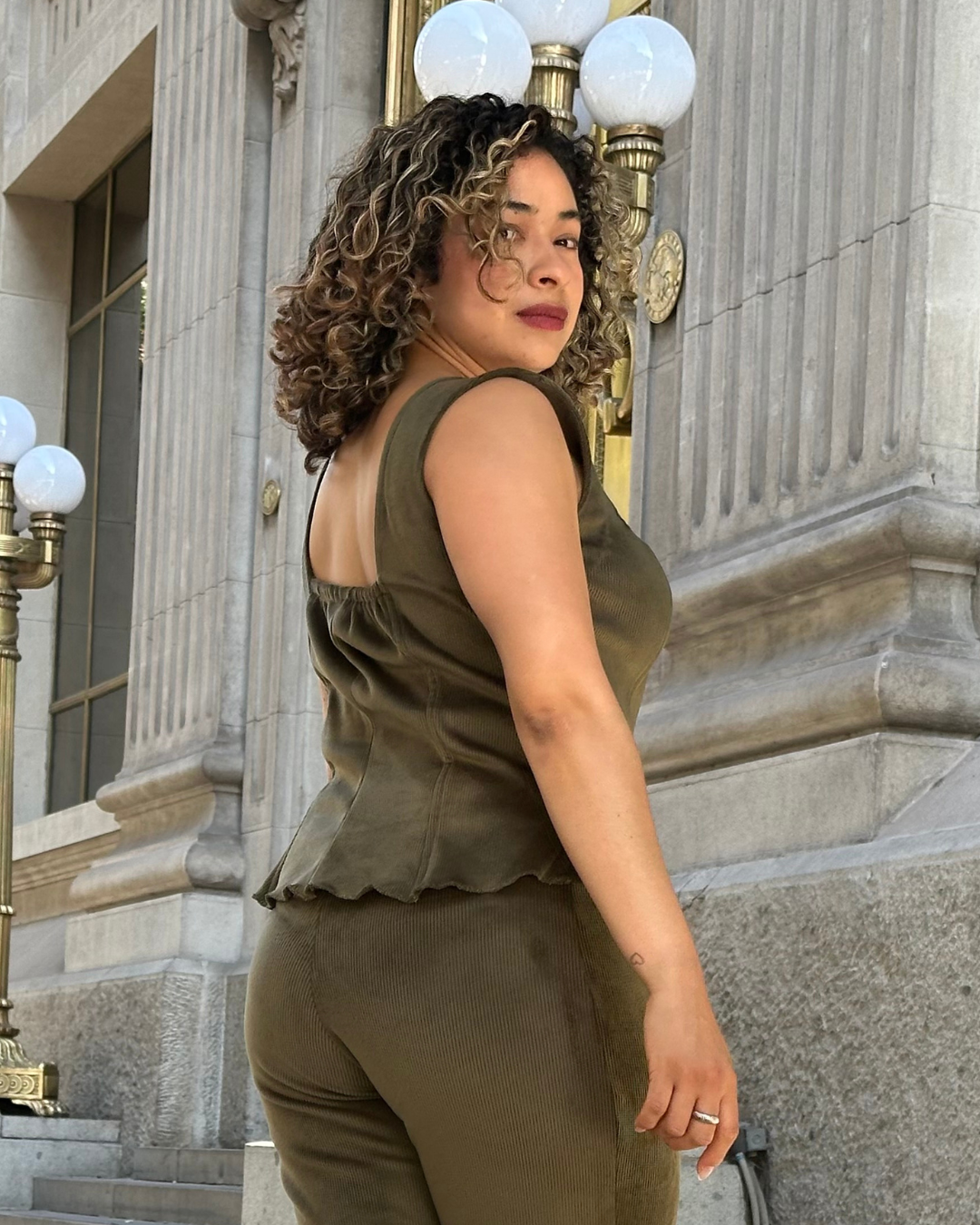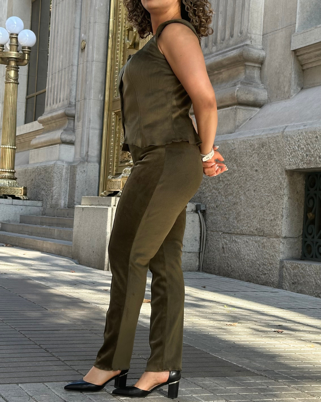 Conjunto de dos piezas en color verde oliva con textura exterior acanalada e interior de polar térmico. Incluye chaleco sastrero y pantalón de tiro alto. Estilo, estructura y calidez en una sola prenda.